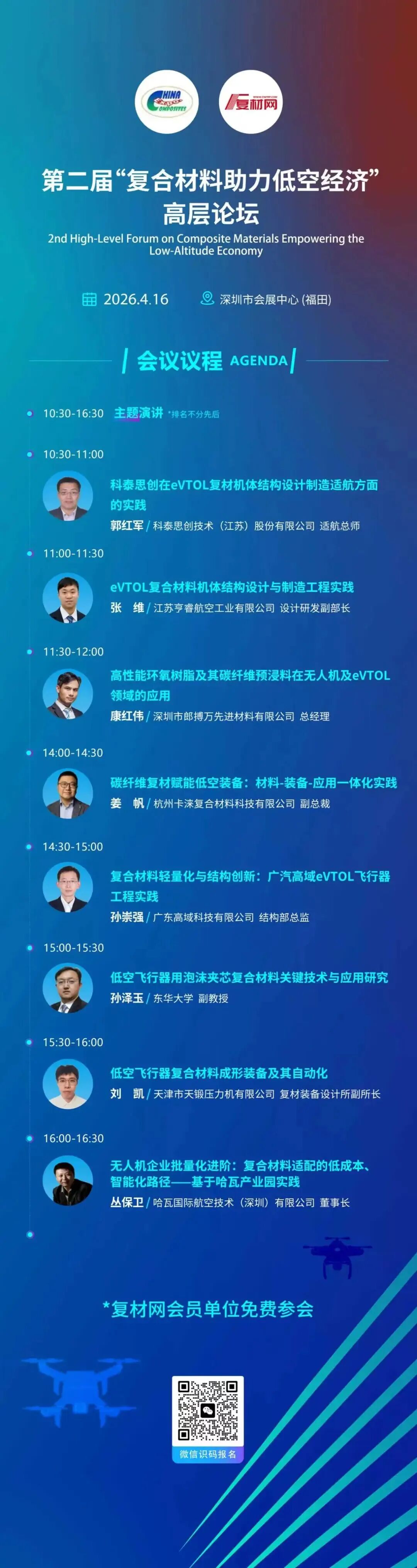 展会同期举办的“复合材料助力低空经济”高层论坛,将邀请行业权威专家、政策制定者及产业链头部企业,深度解读政策导向,剖析市场机遇,帮助您精准把握这一历史性风口。