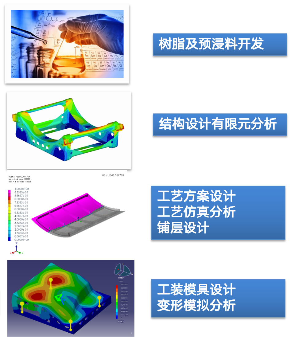 为客户提供从材料、设计、工艺及制造端复合材料全产业链整体解决方案。