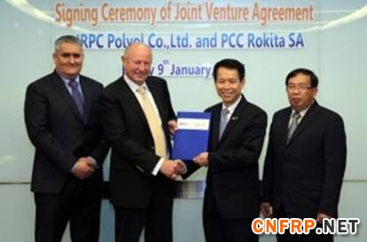 合资签署仪式:(自左向右)PCC Rokita董事长Wieslaw Klimkowski,PCC集团所有人兼副总裁Walderma Preussner,IRPC总裁Sukrit Surabotsopon,IRPC总经理Boondech Puri。