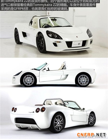 Tommykaira ZZ的车身外表面覆盖件采用的是GFRP(Glassfiber Reinforced Plastic,玻璃纤维增强塑料,俗称玻璃钢)材质来打造富有动感的车身线条及圆滑的车身曲面。GFRP材料具有质量轻而且硬、不导电、机械强度高的特点。