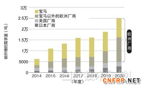 在此次发布的消息中,除了两公司的业务合并以外还有两点受到了关注。,三菱丽阳公布了汽车领域2020年之前的碳纤维需求预测(图1)。预测显示,2020年的需求将由2014年的6000吨左右激增至2.5万吨。2013年碳纤维的整体需求才为几万吨,由此可见汽车领域将成为碳纤维的主要用途之一。