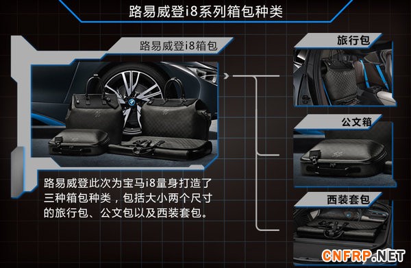 此次路易威登专为宝马i8量身打造的箱包类型共有3款,分别为大小两个尺寸的旅行包、公文箱以及西装套包。宝马i品牌旗下车型均采用高强度的碳纤维车身进行打造,其轻量化带来的出色燃油经济性以及良好的车身刚性都代表了i品牌的特点。路易威登此次推出的i8专属箱包同样也采用碳纤维复合材料打造,并和i8的空间大小完美融合。这种超轻并且强韧的材料可经受起长途旅行的考验,其黑色的设计也与i8的车身颜色进行完美的匹配。