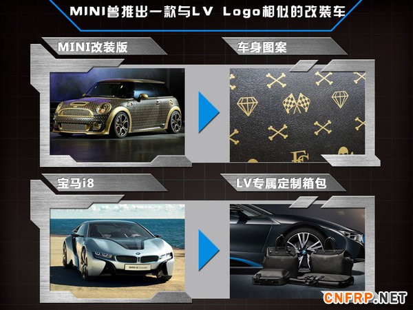 早在2011年,宝马旗下MINI品牌曾由CoverEFX改装了一台MNI车型,其车身图案与LV的经典花纹相似,从远处看很难辨别。MINI车型的改装也为宝马i8与LV的本次合作奠定了基础,随着4月1日这款箱包的上市,这也使得未来购买i8的车主也可以考虑购买一款专属自己车型的箱包。