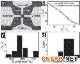 生长石墨烯所用的金属衬底在制备过程中会在表面形成有序的形貌起伏,这种结构会导致转移后的石墨烯薄膜产生大量有序排列的褶皱。四室研究团队通过制备出特殊结构的石墨烯射频器件,围绕褶皱对石墨烯中载流子传输的影响展开了研究,发现这种有序的褶皱会导致石墨烯中载流子的传输具有各向异性的特点:平行于褶皱方向的载流子迁移率比垂直方向的显著提高。该发现为制备高性能的石墨烯射频器件提供了重要的参考依据。