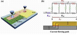 石墨烯与金属电极之间的接触电阻会影响石墨烯射频器件的栅控,从而对器件的频率特性产生不利影响。作为传统薄膜材料研究方法的延伸,目前主要通过TLM方法对石墨烯和金属之间的接触进行表征和测量。四室研究团队通过测定石墨烯接触区和非接触区材料的薄膜电阻,发现两者有很大的差异。进一步的理论分析表明,石墨烯不同区域薄膜电阻的差异会导致传统的TLM方法提取得到的接触电阻与实际值有很大偏差,该发现对测试方法的改良和石墨烯射频器件性能的优化具有重要价值。