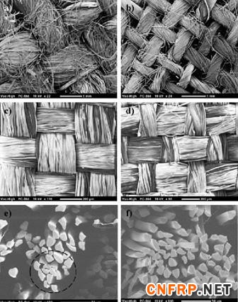 图片说明:平纹织物的SEM照片:(a)亚麻,(b)大麻,(c)A类丝以及(d)B类丝。(e)和(f)分别是丝和纤维的横截面SEM照片。