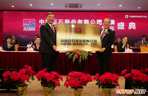 讲话结束后,巨石股份有限公司总裁张毓强从建材集团董事长宋志平手中接过“巨石股份有限公司”的铭牌,此举标志着“玻纤”正式变更为“巨石”。
