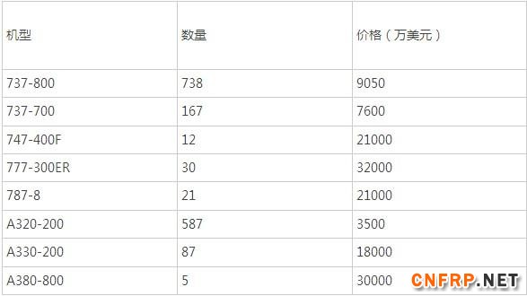 的民航飞机主要被空客和波音垄断,市场亦不例外。截止2015年,各民航公司正在运营的波音飞机共有1141架,空客1120架,总计2395架飞机。下表是一些机型、保有量以及它们的价格。