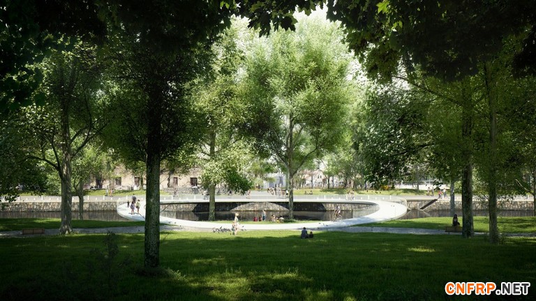 值得一提的是该人行天桥将采用碳纤维这种材质,其狭长的外观就让人觉得仿佛漂浮于水面上。而其环形结构内部的小片园林景观,也将被设计成一个小舞台可供表演使用。