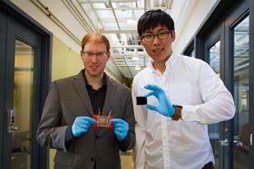 Jeonyoon Lee (右) 持有碳纳米管阵列,Itai Y Stein(左)持有制成的碳纳米管薄膜微型加热器