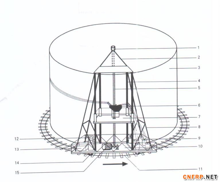 此罐内径32m、高12.6m,整体缠绕制作。大容积罐一般都是立式的,为制造如此大罐,采用了不同于一般的立式纤维缠绕机,即模具(内胆)静止不动,小车在圆周轨道上围着模具转,导纱头导轨在小车上,导纱头上下移动,从而进行缠绕。