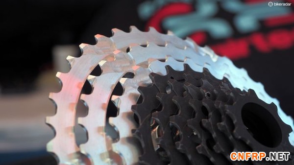 飞轮分为两个部分,银色大齿盘均为3个铝合金齿盘,另外则分为6个和7个钨钢齿盘对应10速和11速。接口方式采用twist-and-lock接口。