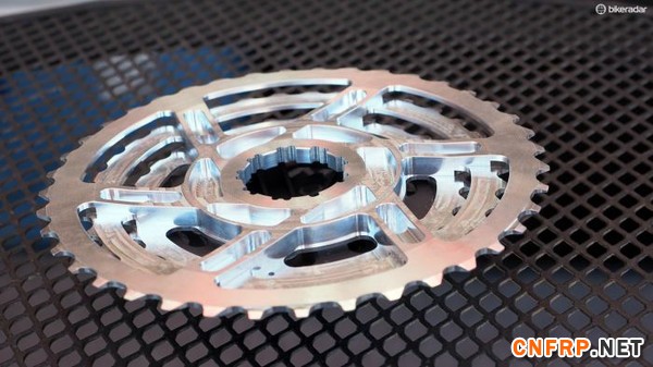 近关于大齿数的炒作非常多,不过这款EXP飞轮设计可以完美匹配SRAM的XD塔基,并且可以使用SRAM XX1变速器提供精确变速。对于大齿数飞轮来说关键难度就是在于飞轮的配置上。在更早的e-thirteen EXP飞轮原型上我们看到大飞轮是一块独立铝合金齿盘,看起来更像飞轮的垫环。