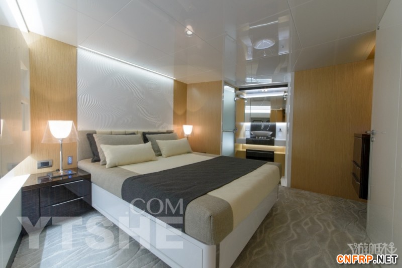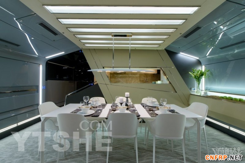 游艇内部装饰的主旨是营造出家的感觉,而外部功能的设计理念则更倾向于娱乐功用。内部的开放式布局提供了良好的通风性和随意性。通过大量落地窗的安装,空间感得到进一步的提升。窗的作用还在于为内部提供充足采光和无遮挡观景视野。