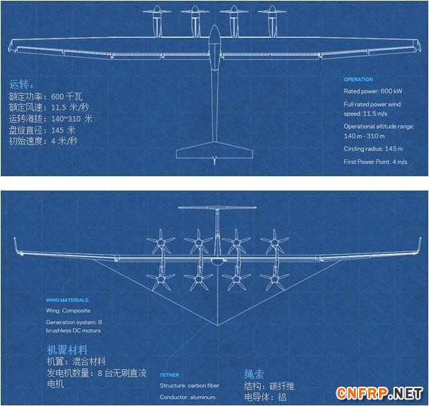 这个名为“Makani”的风力涡轮机看起来就像一架风筝飞在空中,通过高强超轻碳纤维绳索系在地面塔台上。每架风筝约 25.6 米长,配有 8 个螺旋桨,发电容量为 600 kW。当风筝飞上空中后,会以在空中绕大圆圈的形式来推动风力涡轮发电,风筝高可上升至约 426 米的高度。