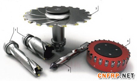 图2. 加工复合材料的套料钻,刀头可换钻,盘铣刀,面铣刀