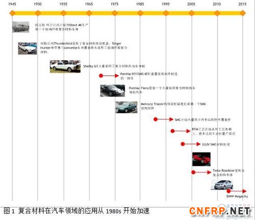 复合材料在汽车领域的应用已经有了一段很长的历史,可以追溯到19世纪50年代,主要用于汽车非结构部件,例如硬质车顶。从70/80年代开始,越来越多地采用热塑性复合材料生产汽车内饰以及用热固性复合材料制造次结构件,例如保险杠的梁。由于复合材料具有很多优点,例如设计灵活、容易成型、轻质和耐腐蚀等,虽然原材料和工艺成本高于钢材和铝,在汽车领域还是获得了一些应用。喷漆以后钢汽车构件的成本大约是3-4欧元/公斤,复合材料次结构件的成本大约是8-10欧元/公斤。