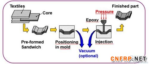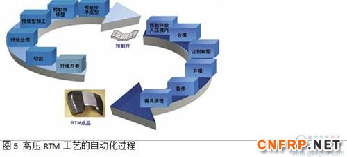 通常RTM工艺的注射压力是 6-15bar大不超过20bar,工艺周期大约1小时。但是高压RTM工艺,注射压力在10-60bar,工艺周期大约6分钟。