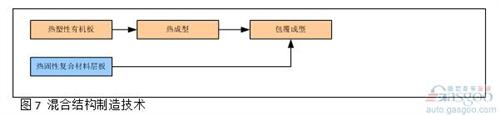 采用全塑料的“有机板混合结构”取代汽车中的塑料-金属的“混合”结构。新的工艺直接在连续板材的基础上,预成型,然后包覆成型,代替过去在金属预成型件的基础上通过包覆成型,加上加强筋。恩格尔和克劳斯玛菲都是采用尼龙6热塑性树脂层纤维织物压板(热成型),在加上尼龙6(加或者不加纤维增强)包覆成型。材料厂家是德国Bond-Laminates的Tepex有机板,以及朗盛的尼龙包覆成型颗粒料。恩格尔称之为:Organomelt工艺,克劳斯玛菲则称之为FiberForm工艺。包覆成型的混合结构工艺不仅仅可以对热塑性适用,也可以用于热固性的复合材料混合部件,参见图7。
