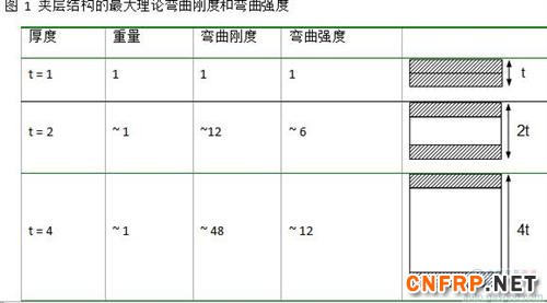 表1比较了不同结构中大弯曲刚度和抗弯强度。 这三个结构具有相同厚度的表面铺层, 以及不同厚度的夹芯。 运用夹层结构理论, 我们可以用较少的铺层材料, 而达到比较高的结构强度。