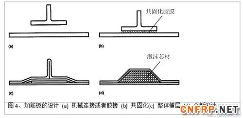 在弯曲和轴向压力作用下,薄壁复合材料结构常常会发生稳定破坏,失稳破坏总是在材料到达压缩破坏强度以前,在受压部位出现,为此工程师常常设计加筋条结构。对于常用的加筋板,图4(a)中,加筋板分3步制造,包括面板固化、加筋条固化和二次胶接。尽管可以通过一些高效率、低成本的方法,例如挤出工艺制造出加强筋,但是由于采用了二次胶接,抵消了成本优势。另外一种方法是加强筋和面板采用共固化工艺,如图4(b)所示,设计中可以采用和树脂有相同固化周期的胶膜来提高胶接面整体性。加强筋可以经过预固化或者未经预固化,这样加强筋和蒙皮结合在一起。图4(c)中,增加了设计尺度,这也带来微观的设计。图4(d)是放弃整个I形加强筋的概念,采用泡沫填充帽形加筋条的设计方法。和空心的帽形加筋条结构相比,避免了帽筋条的侧壁产生失稳,导致结构过早破坏。