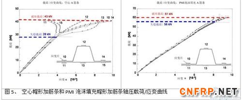 泡沫填充帽形加筋条的面内压缩强度和空心加筋条相比,在结构出现初始失稳时,失稳载荷提高约100%(图 5)。芯材主要承受和加强筋侧表面垂直方向的拉应力和压应力,避免在碳纤维/环氧复合材料面板达到屈服强度前,结构过早地发生失稳破坏。