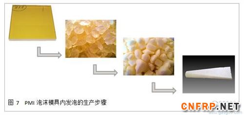 在这种工艺中, PMI泡沫聚合板被粉碎为颗粒, 并且通过预发泡来获得想要的密度。 这一步非常重要, 即必须在聚合物中保留一定数量的发泡剂。然后将这些颗粒装入封闭的模具内加热,发泡会重新开始,这些颗粒将不断的增大。 由于模具型腔的限制,这些颗粒会不断地变形, 并且终填满整个模具型腔。 冷却阶段中, 这些聚合物会回到稳定的状态, 然后就可以开模取出具有与模具一致形状的泡沫芯(见图7)。