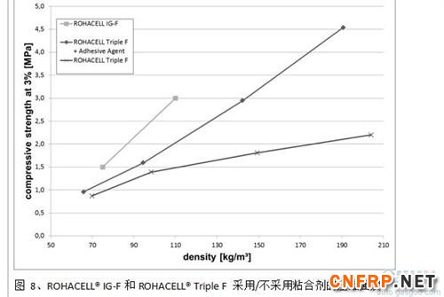 通过实验, 我们发现通过颗粒发泡的泡沫材料, 其性能低于完整发泡工艺的泡沫。 通过将ROHACELL® IG-F和ROHACELL®Triple F进行对比试验, 抗压强度以及抗剪切强度都发生了显著的降低, 这主要是由于颗粒之间较低的结合力造成的。 为了改善这一问题, 在预发泡的颗粒中需要加入粘合剂。 在模具内发泡时, 高温会让粘合剂融化, 在冷却后形成颗粒之间良好的粘结强度。 这极大地改善了泡沫芯材的机械强度, 在高密度的应用中, 甚至能够达到正常工艺生产的ROHACELL® 泡沫(见图8)。