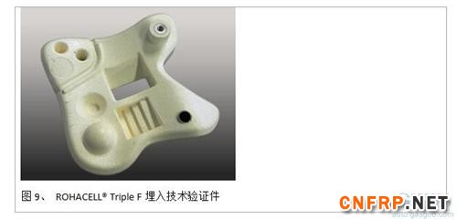 与数控加工相比, 模内颗粒发泡工艺的另外一个明显的优势是可以埋入其它不同的材料。 金属或者其它可以耐受高温的塑料都可以在模内发泡时候进行埋入, 这样可以高度整合其它的结构部件。 比如, 典型的应用是可以埋入螺栓套。图9展示了一个埋入工艺的工艺验证件。这证明了通过ROHACELL® Triple F, 可以获得各种复杂形状的泡沫芯材, 以及各种表面结构。