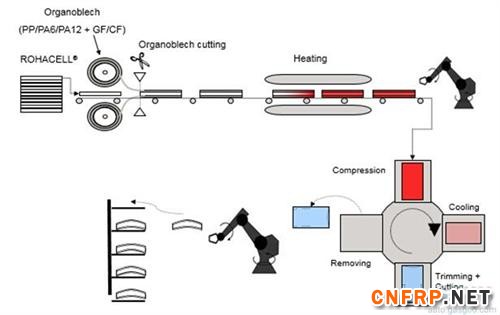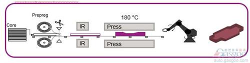 “有机板(Organosheet)”的混合结构部件成型工艺的生产流程是:先加热一个用PA6连续纤维增强有机板,然后将其放入注塑模具中,热成型出一个三维形状,并用另外的PA6树脂(未填充的或者是玻璃纤维增强的)对其进行包覆成型。在某些情况下,在将板坯放入注塑模具中前,先对其进行热成型。