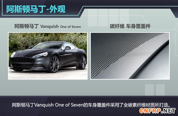 阿斯顿马丁Vanquish One of Seven采用了轻量化的设计理念,这也迎合了时下超级跑车界的发展潮流,全碳纤维打造的车身不仅能够提升其动力表现,还使新车具有更强的视觉冲击力,而这也从侧面表现出了这款全新车型的高贵身价。
