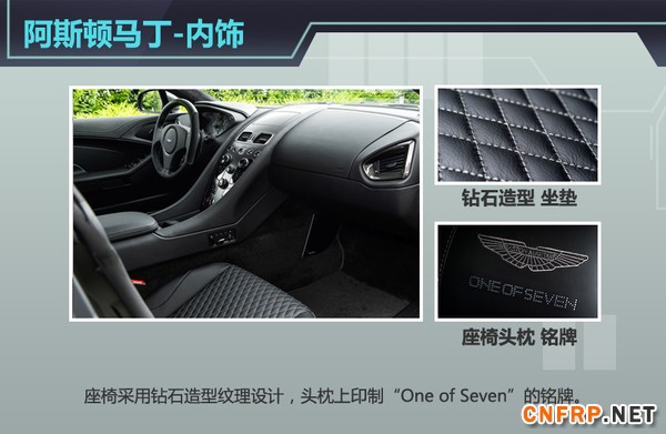 作为阿斯顿·马丁Q定制系列车型,这款阿斯顿马丁Vanquish One of Seven的车身采用了全碳素纤维材质打造,碳纤维黑色的外观营造出了一种神秘气质。而内饰也秉承了英伦跑车的尊贵特质,座椅采用钻石造型纹理设计,头枕上印制“One of Seven”低调而奢华的logo。