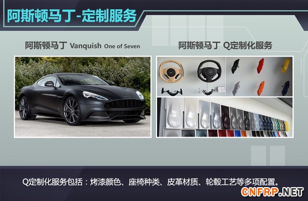 阿斯顿马丁的Q定制化服务主要针对于向客户提供其特制的烤漆颜色、包括座椅种类、皮革材质、轮毂工艺,以及精细的纯手工缝制技术、碳纤维材质饰物和特制仪表板,完全可以体验到各类定制方案。