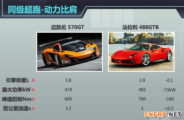 法拉利作为超跑制造商,在各大赛事中均有所涉足,而全新法拉利488GTB则代表了品牌旗下中置引擎超级跑车的代表。就动力表现而言,迈凯伦570GT虽然在大功率及峰值扭矩方面不及法拉利488GTB,但凭借全新设计的空气动力学套件及碳纤维车身覆盖件,能够使得这款全新GT超跑在实际的动力表现中与其持平。