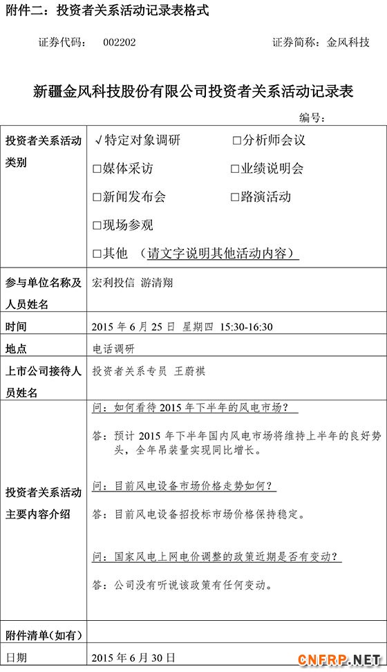 金风科技在新披露的《投资者关系活动记录表》中表示,预计2015年下半年国内
