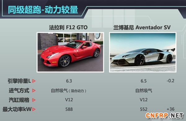 在豪强云集的超跑阵营当中,兰博基尼Aventador SV则是法拉利F12 GTO的宿敌。兰博基尼Aventador SV曾凭借552kW的动力表现从F12 Berlinetta的手中夺走了量产超跑中动力强的头衔。但随着全新F12 GTO车型的推出及问世,法拉利将一度夺回本应属于自己的荣誉。此外,针对于法拉利F12 GTO而言,其搭载的全新混合动力系统也在科技配备上进一步拉开了与兰博基尼Aventador SV的距离。
