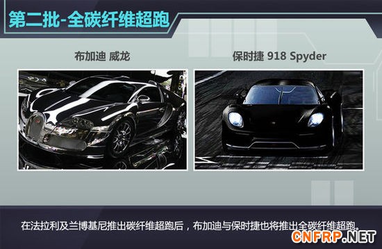 除兰博基尼及法拉利等车型外,保时捷旗下的顶级超跑918 Spyder与布加迪威龙也将与美国Vitesse公司进行合作,将原本全铝合金材质的车身覆盖件用碳纤维覆盖件替换,终使这种应用与航天领域的材质将新车100%包裹,从而达到更强的动力表现。