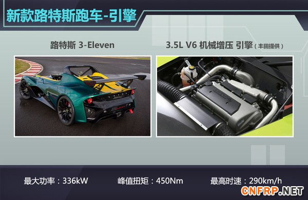路特斯3-Eleven在动力单元中搭载了一台有丰田提供的3.5L V6机械增压引擎,此款引擎在经过调校后,能够在引擎转速处于4500rpm时产生336kW的大功率。当引擎转速攀升至7000rpm时则可爆发出450Nm的峰值扭矩,对于一款整备质量不足900kg的轻量化跑车而言,足以推动车体在3秒内破百,并将极速推进至290km/h。