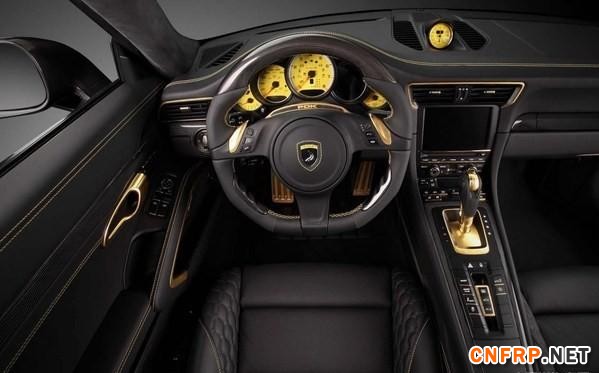 以Porsche911TurboS为基础打造出的StingerGTR,全车在24处都换装了碳纤维,包括前盖、前后保杆、前下扰流、侧裙、后下分流器、叶子板进气孔及尾翼等。另外该车还换装运动悬架、ADV5MV2SL21寸锻造轻量化铝圈、双边四出排气尾管等套件。而内饰更是有黄金和碳纤维的搭配。