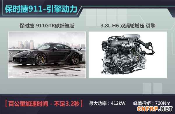 由于全新911 GTR碳纤维版车型是基于保时捷911Turbo S所打造而来,因此新车在动力单元中或将维持现款车型的水平。被安置在后轴位置的3.8L水平对置6缸引擎在双涡轮增压器的介入后,可将引擎的大功率压榨至412kW,并且产生700Nm的峰值扭矩。而得益于大面积碳纤维复合材料的应用,将使得这款全新911 GTR碳纤维版车型表现出更强的加速特性,进而将百公里加速时间缩短至3.2秒以内。