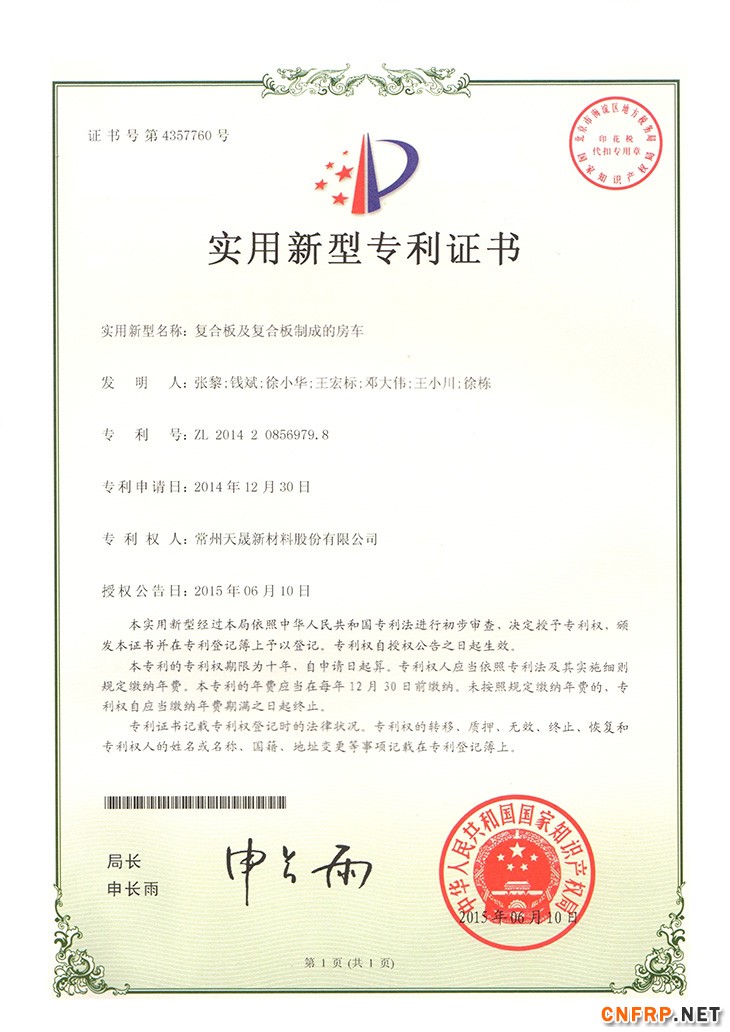 近日,由天晟研发的“复合板及复合板制成的房车”及“型材及型材制成的房车”获得知识产权局颁发的实用新型证书。