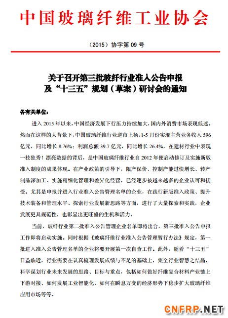 关于召开第三批玻纤行业准入公告申报及“十三五”规划(草案)研讨会的通知
