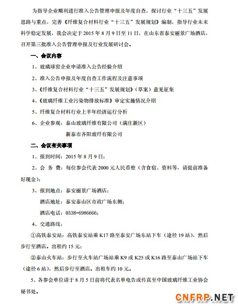 为指导企业顺利进行准入公告管理申报及年度自查,探讨行业“十三五”发展思路与重点,完善《纤维复合材料行业“十三五”发展规划》编制,指导行业未来科学稳定发展,我会决定于2015年8月9日至11日,在山东省泰安丽景广场酒店,召开第三批准入公告管理申报及行业发展研讨会。