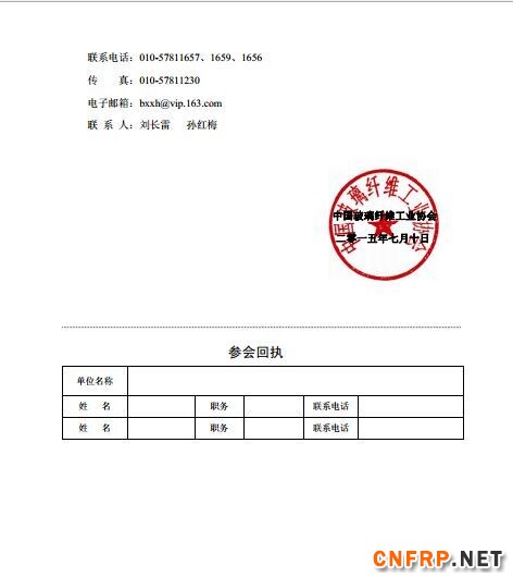 5、各参会单位请于8月5日前将代表名单电告或传真至玻璃纤维工业协会秘书处。
