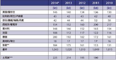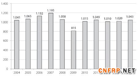 图1. 自2004 年以来欧洲GRP 产量按千吨计。(2014* 年为估计)
