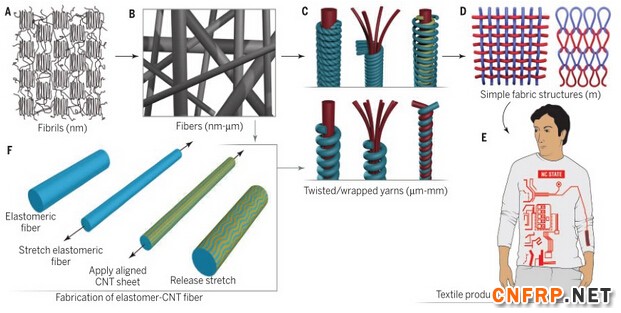 如图所示为分层结构的纺织品以及其作为柔性电子产品的潜在应用。分层结构的纺织品的典型长度如下:(A)图的纤维为呈簇状分布的聚合物分子规则排列(晶体)和无序排列(非结晶)的部分;(B)图为具有很高长宽比的合成纤维,这些纤维由天然聚合物和合成聚合物制得,聚合物可以是一种,也可以是多种,呈横断面形状排布;(C)图为后组装制得的纤维,原材料为纱线,纱线通过扭曲或包装等流程制得纤维;(D)图为纱线加工成的织物,其中纱线在制备织物过程中可以形成各种各样的结构,当然,还有其他利用聚合物生产纺织产品的方法还没有介绍出来;(E)图常常用于制备三维纺织面料,人们可以在分层纺织品的任一层制备功能材料;(F)图为Liu等人制备的高弹性碳纳米管芯纤维,这些纤维可以直接引入(C)中的纱线、(D)中的面料或者(E)中的产品里。