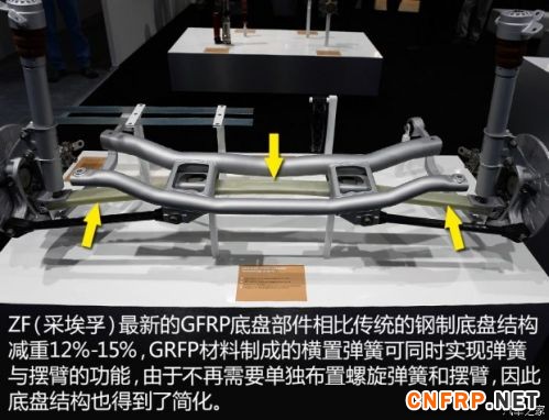 在2015年初,因自动变速箱而被国人熟知的德国零部件巨头ZF(采埃孚)展出了他们新的GFRP底盘部件。相比传统的钢制底盘结构,使用了GFRP质横置板簧的车桥部分可以减重12-15%,而由于不需要在单独布置螺旋弹簧和摆臂,因此底盘结构也得到了简化。
