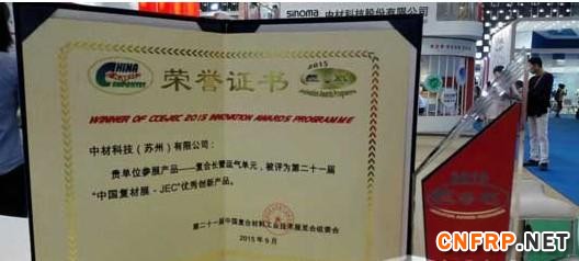 第21届国际复合材料工业技术展览会是亚太地区规模大、具影响的复合材料行业展览会,于2015年9月2日至4日在上海世博展览馆拉开帷幕。国际复合材料工业技术展览会还是唯一经科学技术部批准的国际性复合材料专业展览会,经历20届的成长,已经成为亚洲地区规模大的复合材料行业盛会,被业内称为"复合材料行业的风向标"。历届展出内容涵盖复合材料全产业链,涉及各种原材料、工艺设备和复合材料制品,包括玻璃纤维、碳纤维、芳纶纤维、玄武岩纤维,以及上述增强材料的制品,以实物展出、现场操作演示、专业讲解等多种形式开展技术交流与经贸洽谈。中材科技(苏州)有限公司是一家有着丰富经验的级高新技术企业和批创新型试点企业,在产品的设计、整体制造技术水平、生产线自动化和复合气瓶生产规模等方面均居国内同行业。其新产品--复合长管运气单元,获得了第21届国际复合材料工业技术展览会的创新产品奖,参加了9月2日上午11:00在创新产品新闻发布会会场(上海世博展览馆2号馆)召开的"复材展-JEC"创新产品颁奖大会。随后,"复合长管运气单元"将专门展览在"创新产品展区"。