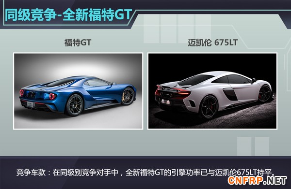 虽然福特GT并非为超豪华品牌旗下的超级跑车,但在性能方面已接近迈凯伦675LT的动力水平。值得一提的是:由于福特GT搭载了体积更小的V6双涡轮增压引擎,因此在重量与体积方面将低于迈凯伦675LT所使用的V8双涡轮增压引擎,而这也将进一步提升福特GT的动力推重比,使其具有足够的实力向迈凯伦675LT等一系列超跑发起挑战。