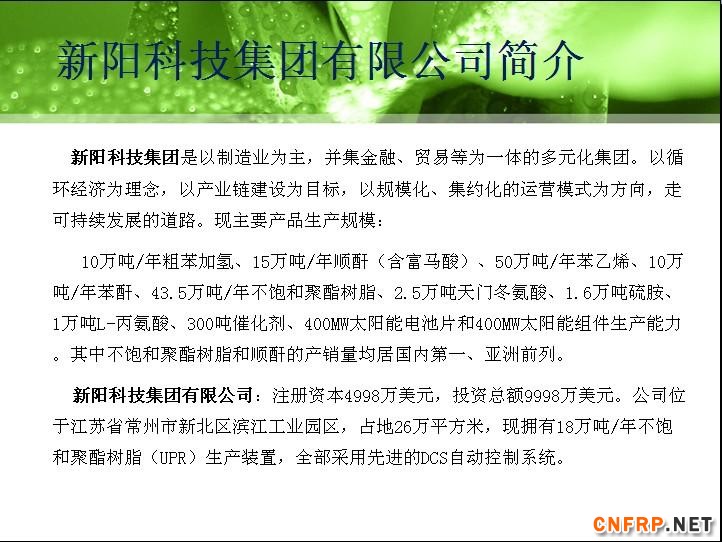 新阳科技集团是集制造、金融、贸易为一体的多元化企业,主要生产复合材料上游原料等产品,其中不饱和聚酯树脂和顺酐产销量居国内,亚洲前列,其生产设备全部采用先进的DCS自动控制系统。